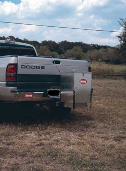This picture shows the DF3R road feeder installed on the tailgate of a pickup truck. An electrical cord leads into the cab of the truck and plugs into the cigarette lighter