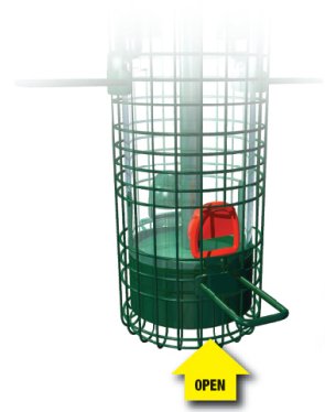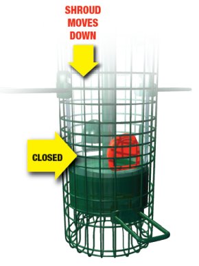 How it works: Openings in the wire shroud align with seed ports and provide birds access to the seed. When a squirrel climbs onto the feeder, its weight automatically forces the shroud down, closing access to the seed ports. All squirrels and many large birds are foiled but not harmed in any way.