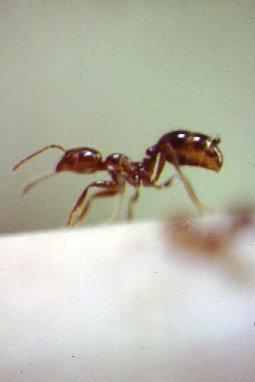 Fire ants feed on many things, including insects, oil from seeds, meats, grease and honeydew. The ants cannot eat solid food, and must extract or liquefy the food source. This liquid food is passed to the other ants in the colony including the queen and the developing young ants or brood. Worker ants search for food up to 100 feet away when the temperature is between 70o F. and 90o F. during the day or night. When temperatures exceed 95o F., fire ants only forage night. Their foraging tunnels can be 50 - 100 feet long. Fire ants are very typical of ants in general. In addition to workers and a queen, mature colonies contain males and females capable of flight and reproduction. These individuals are generally called “reproductives.” The average colony can produce about 4,500 reproductives per year. On a warm day, usually one or two days following a rain, the workers open holes in the nest through which the reproductives exit for a mating flight. Mating takes place 300' to 800' in the air. Mated females (are attracted to shiny surfaces) descend to the ground, up to 12 miles away, break off their wings, and search for a place to dig the founding nest, a vertical tunnel 2" to 5" deep. They seal themselves off in this founding nest to lay eggs and to rear their first brood of workers. During this period they do not feed, instead utilizing reserves stored in their bodies. The first worker brood takes about a month to develop; these are the smallest individuals in the entire colony cycle. Fire ants open the nest, begin to forage for food, rear more workers, and care for the queens. Hereafter, the queen or queens essentially become egg-laying machines, each able to lay up to 1,500 to 1,600 eggs per day and can live 2 - 7 years. If the colony is disturbed, the workers swarm over the mound for 8 minutes; if the disturbance continues, the workers will quickly carry the queen through underground tunnels so she can begin a new colony.